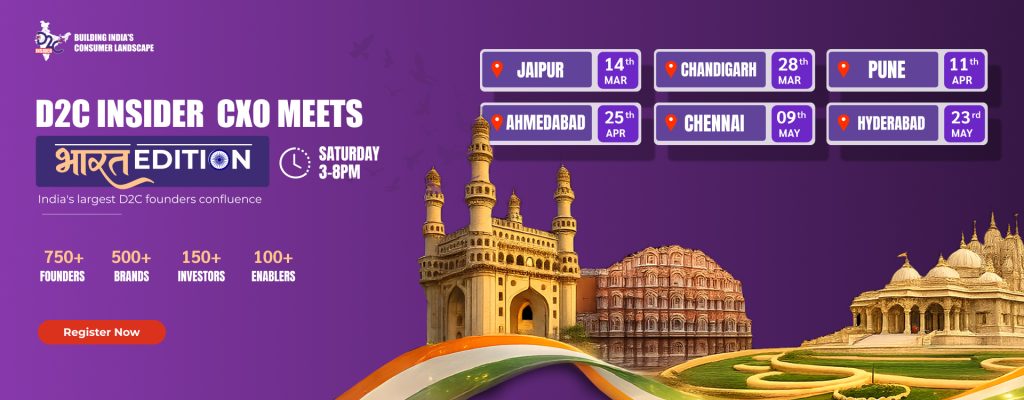 D2C INSIDER CXO MEET — BHARAT EDITION India’s Largest D2C Founders Confluence for Tier 2 & Tier 3 Cities The future of India’s consumer revolution is rising from Bharat. The Bharat Edition of the D2C Insider CXO Meet is a high-impact, multi-city platform created exclusively for founders and leaders from Tier 2 and Tier 3 cities. It is designed to give emerging brands the exposure, access, and community they need to scale faster, learn from industry leaders, and build meaningful partnerships.